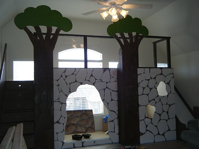 In this part of the club house is a secret room for the children play. Designer, Jody, had cut outs made in the shapes of the exterior rocks to allow for plenty of natural light and airflow in the shape of pee-a-boo rocks for the kids. Here is Alex looking out one of the cut outs before the rocks were painted.
