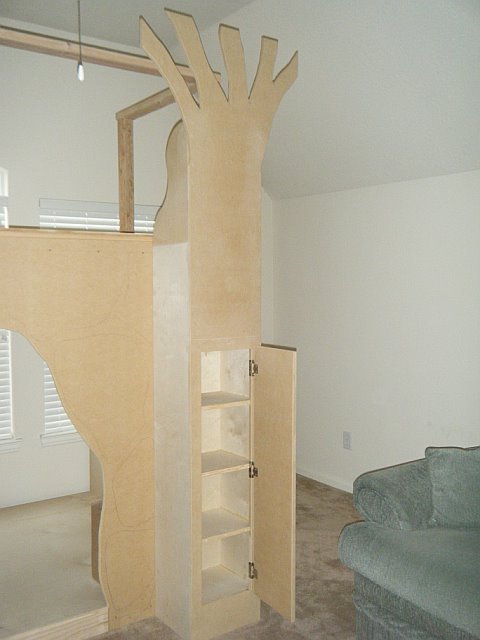 Storage is always a major concern for our clients. The trunks of the tree are not only decorative they are also functional. On one side the trunk is hollowed out and shaped like a squirrel hole to serve as a toy box. The opposite tree trunk opens to revival hidden shelves.