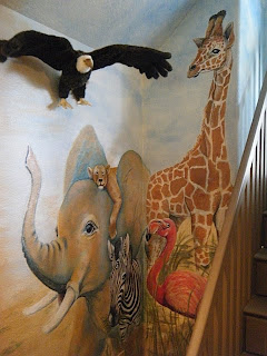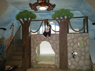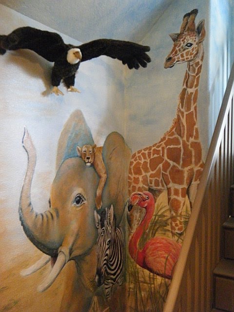 Rhonda Raley, a faux-artist, pained a beautiful mural, designed by Brown Interiors. Full of vibrant colors and exotic animals. After the first consultation with the homeowners about the mural; one of their children said she wanted to be sure the animals were friendly. We took much pride and care in designing friendly faces on the animals. Jody, selected the stone/ rock design and colors; and Rhonda, painted the realistic rocks on the exterior of the tree house. She added texture and stamped in fossils along the way. Adding to the custom design. The children will be able to search for new treasures in the rocks, such as fern fossils, butterflies and lizards. The tree trunks are also textured and faux painted with texture. A clear blue sky was added to the ceiling to add ambiance and character setting the perfect scene for the tree house. By painting the walls around the tree house we were able to designate the spaces between adult and child.