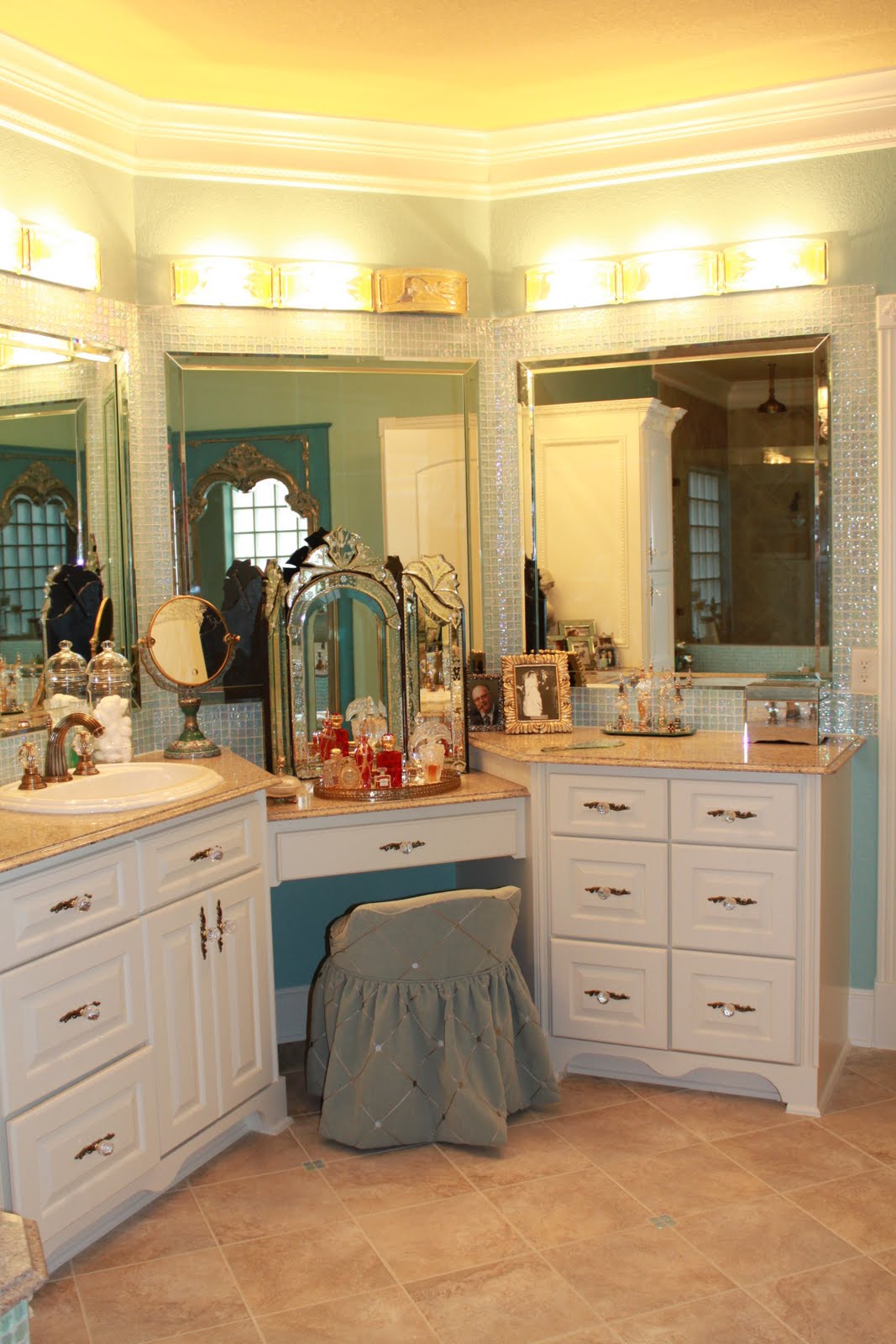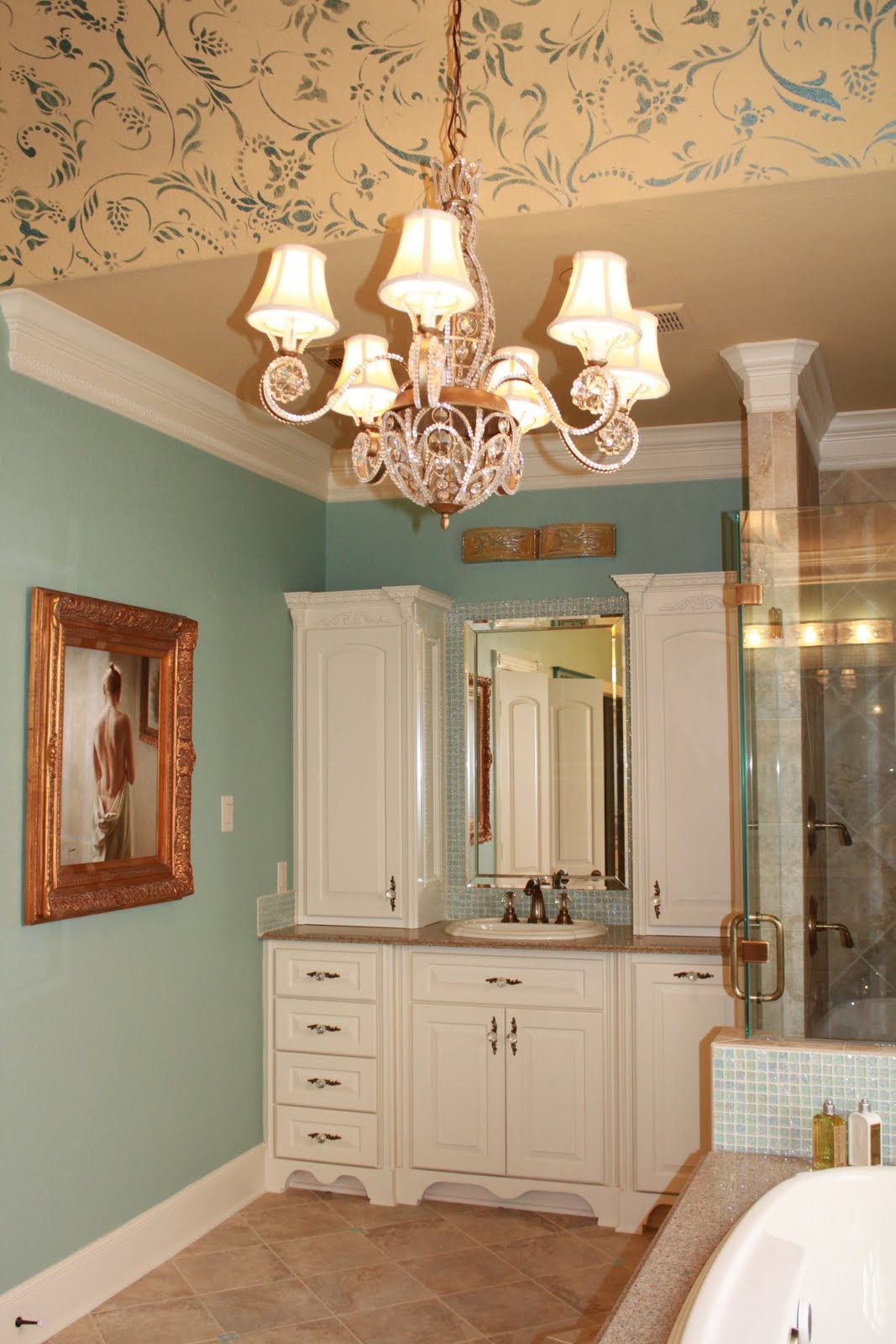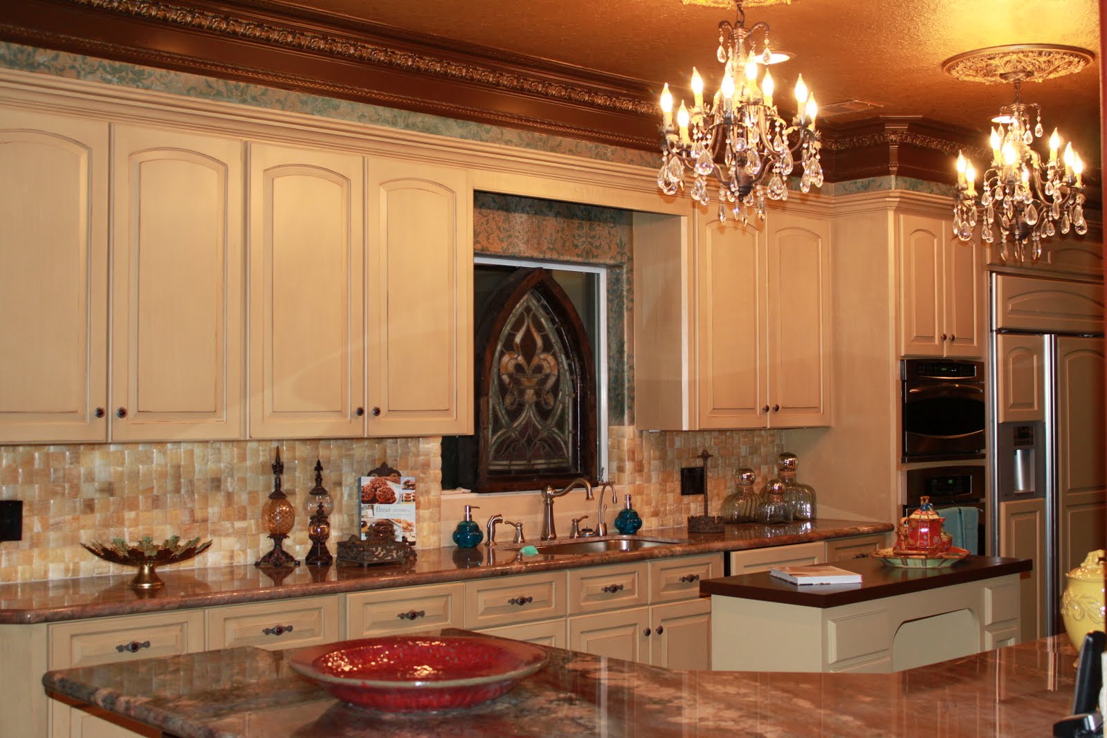 The kitchen was by far our favorite room. The pendant lights were searched for by Brown Interiors, once found we knew we had the perfect lights to bring the rich colors together from the family room to the kitchen. In the center of the kitchen we used two crystal chandeliers spaced on each side of the island. The cabinet doors were selected by Jody and then painted camelback with a brown glaze. Jody wanted the granite to blend turquoise, gold and red. This exotict selection was found at Houston Carpet and absolutely to die for. The tile under the bar that faces the family room is an oversize 3-d pattern with high and low tiles. It looks like ivory! We liked it so much we decided to use it on the backsplash and around the fireplace in the living room.