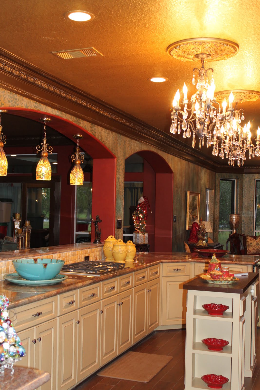 This dining room was right off the living room. We debated about whether to try and seperate the space with walls and french doors or colums. In the end we decided it was best to keep the space as open as possible and make it an exact match with the family room. The chandelier is made of turquoise crystals and we acutally painted half of the crystals a blinging gold to add pop!KITCHEN: