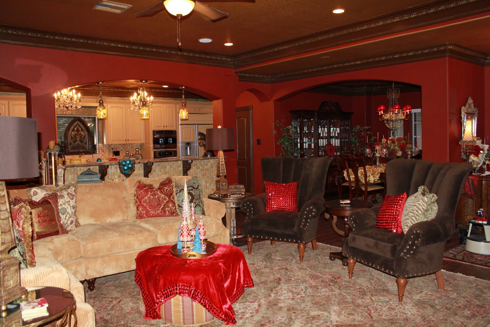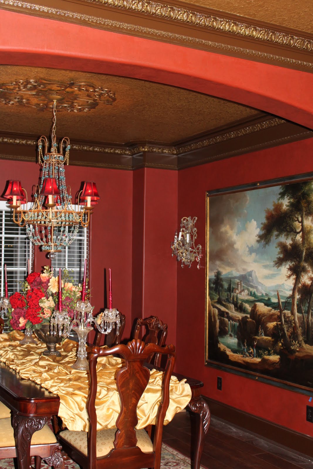 Before the living room was covered in yellow oak built-ins and the fireplace was to say the least, NOT a focal point. We wanted this space to set the tone for the rest of the house, ” jeweled”. Jody selected a deep red venetian with a light brown glaze. A rich walnut wood floor spans the room. The ceiling was painted a metallic bronze and after much debate, Jody convienced the home owners that painting the crown molding and trim with a dark brown and highlighting the details with a gold paint was just what the room called for and she was right! Any other color just would not have worked.
