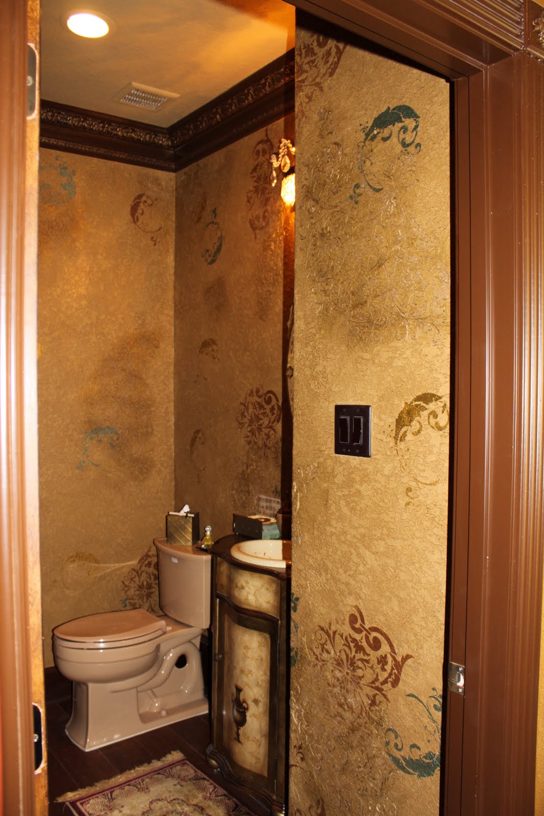 Door to powder bath matches the doors that lead to the Master suite. Walls are faux painted in a combination of metallic paints and raised 3-D stencils. Labor on faux provided by, Britta. The turquoise and deep red stencils alternate with the raised stencils to give a stunning effect. The vanity is from Hooker furniture. Jody selected a custom backsplash with four different metallic 1 x 1 glass tiles, installed by Houston Carpet and Classic. Mexican Sand colored toilet replaced white porceline one that didn’t match our rich decor. Every element in this room is perfectly blended to create a showcase powder bathroom.LIVING/ FAMILY ROOM: