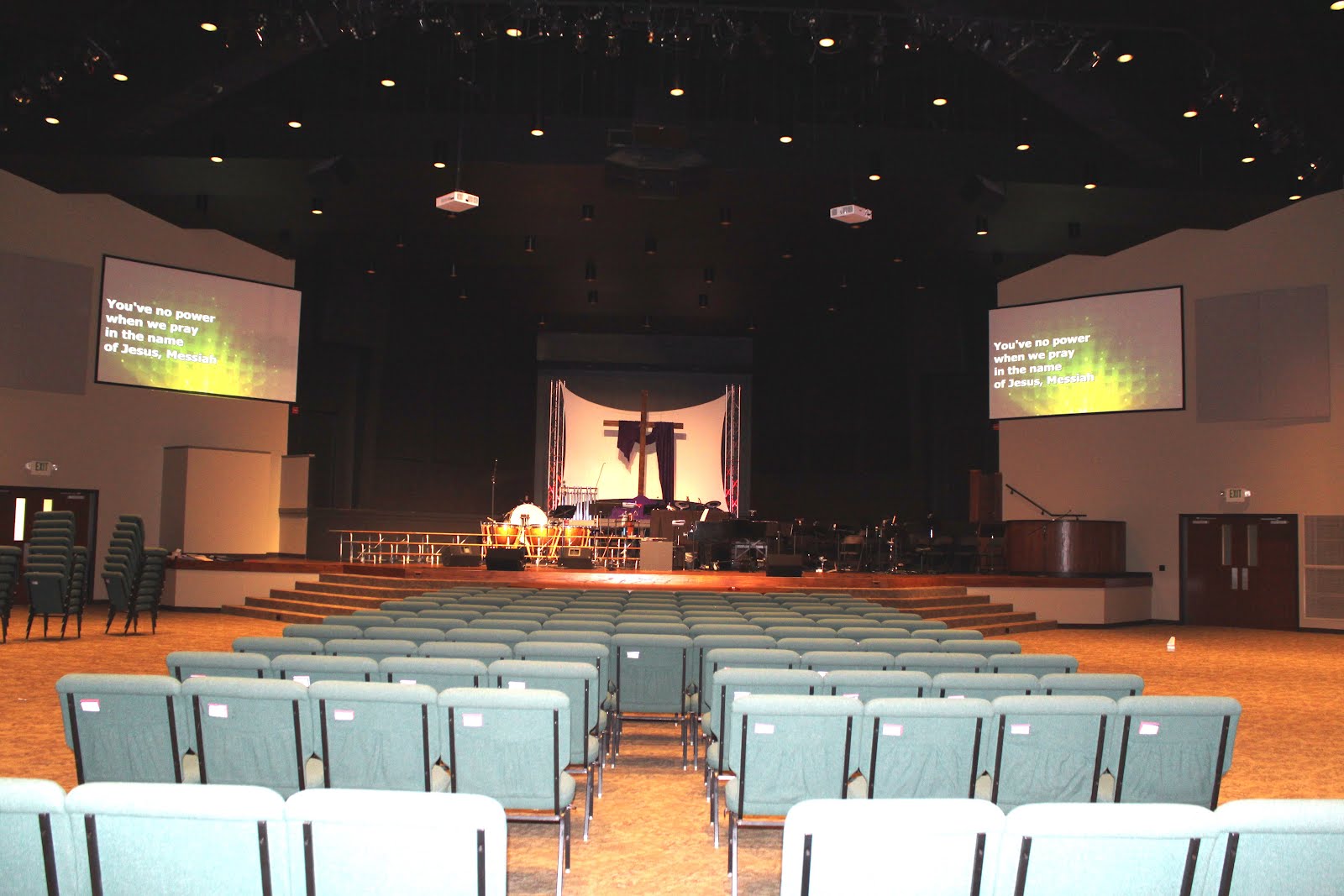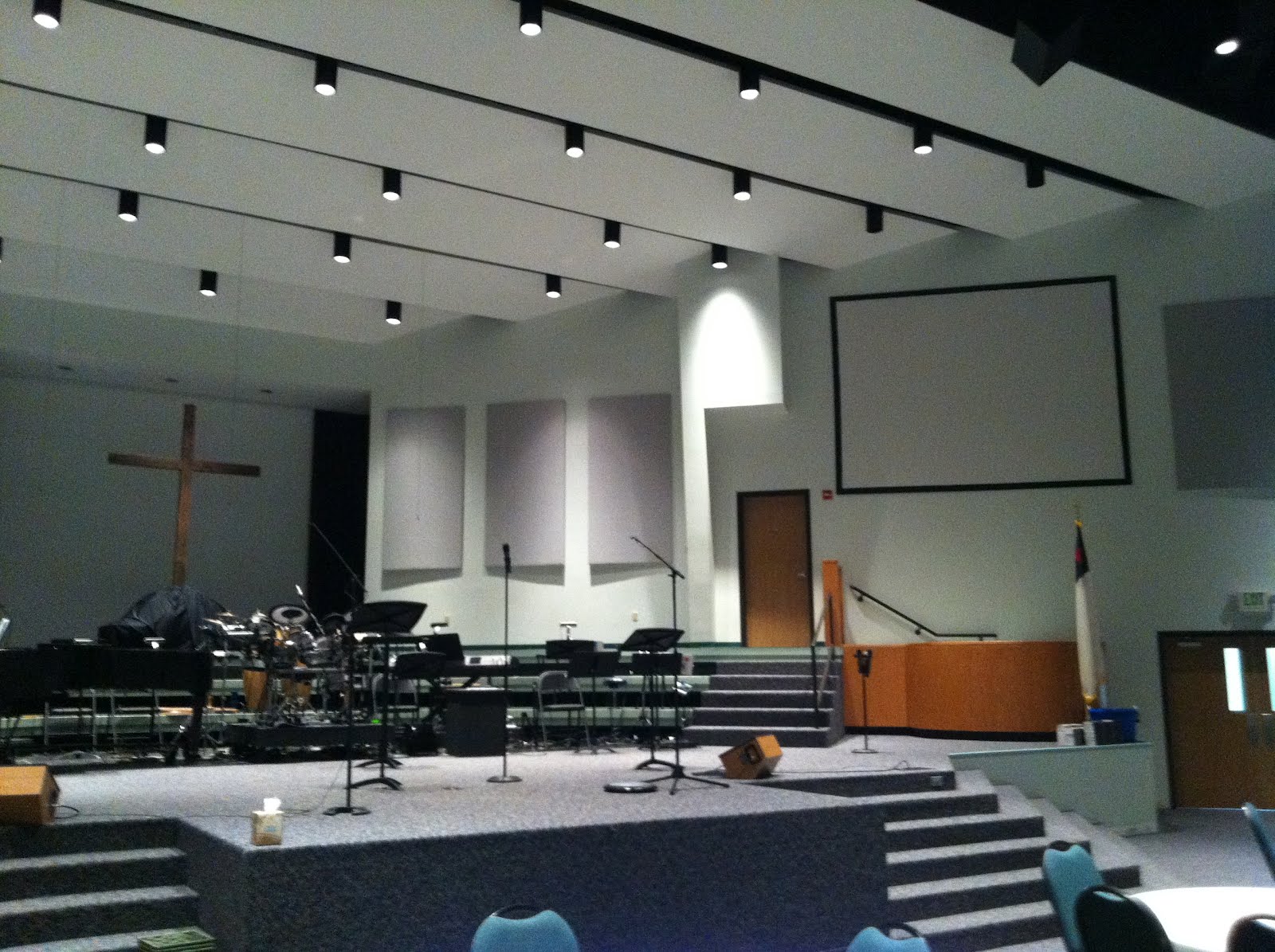Myself, Jody and one of our fabulous designers, Catherine were asked to do the selections for the re-design of Height’s Baptist Church sanctuary. They were looking for a more modern, up to date look. To start we painted the entire ceiling and back drop behind the stage black. (See below) This does two things first it draws your eye right to the focal point the cross in the back of the stage. Secondly, it allows you to concentrate on what is happening on the stage instead of looking at all the light cans, sound screens and distractions.