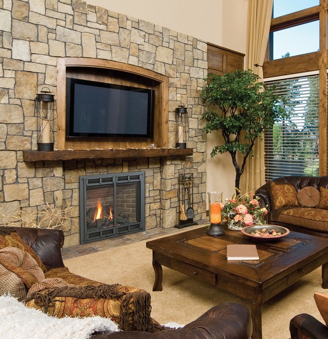 Rather than being open, these indoor fireplaces are enclosed. Traditionally, these indoor fireplaces feature a large glass panel enabling you to view the fire as it burns. This design is such that you have less heat escaping up the chimney and more entering the room so you stay warmer while still having the cozy feel of a wood burning fire.