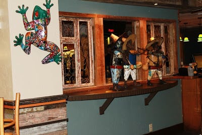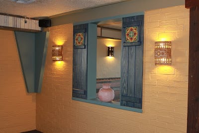 Front eating area AFTER: Custom designed shutters with talavera tile inserts, new paint on brick and trim. Added additional lighting.