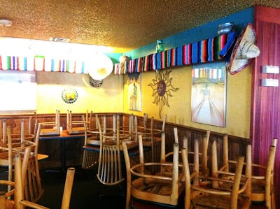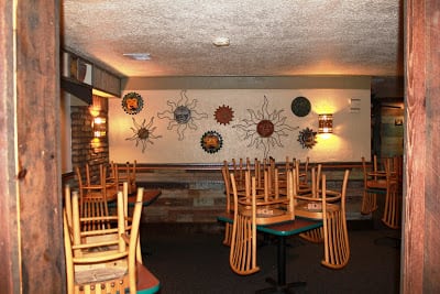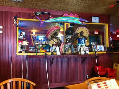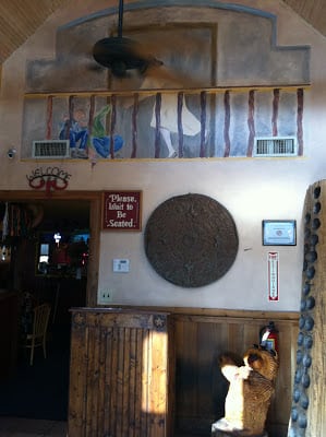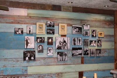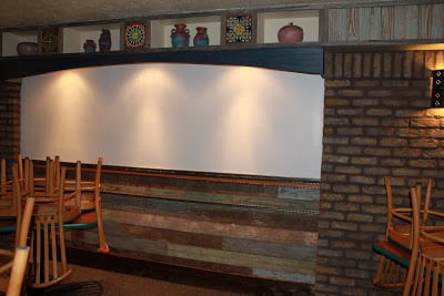 Back wall in eating area AFTER: Brick and talavera accents, antique wood pulled out of historic homes, custom arch to frame Mexican street scene (still to come) with display niche above. Pastel antique wood under mural area has custom designed chair rail and wainscoting made out of steel.