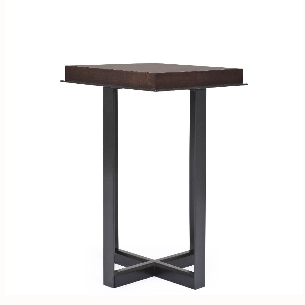 Square off your home decor with the Axis Small End Table. This wood side table features a unique design with its cast iron frame that provides a sturdy and slender look. Made from rubber wood with a walnut veneer, this modern end table displays a pallet of multi-brown hues, while the padded legs are of a graphite hue that exudes modernity.