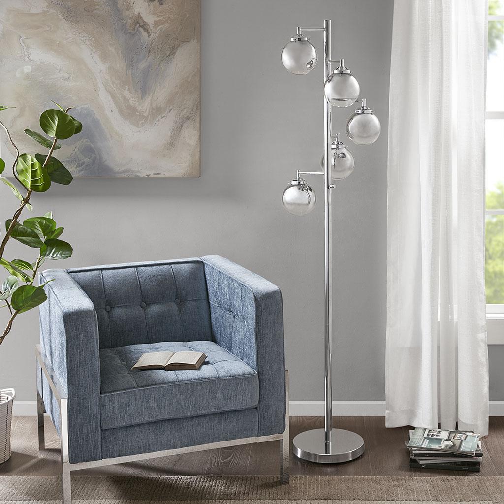 Inspired by modern design our Madison Park Barton floor lamp will illuminate any space. This floor lamp features a five clear glass shades complement the chrome finish for a striking look. Five LED bulbs are needed.