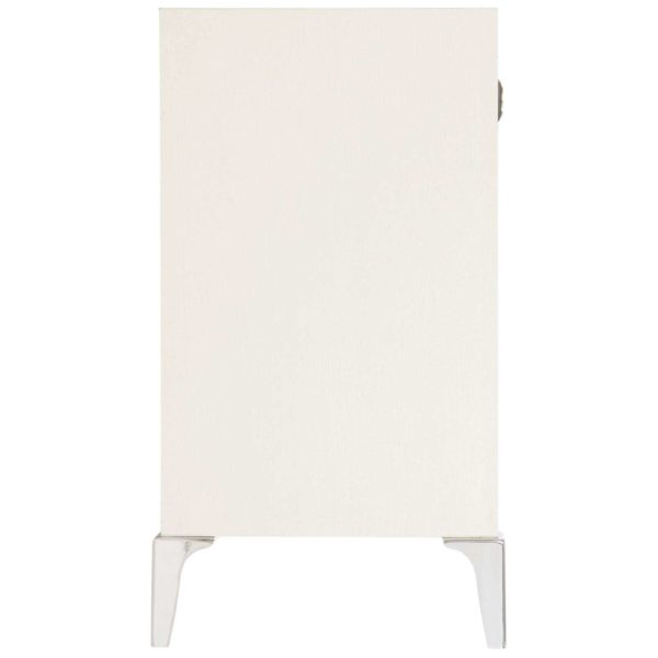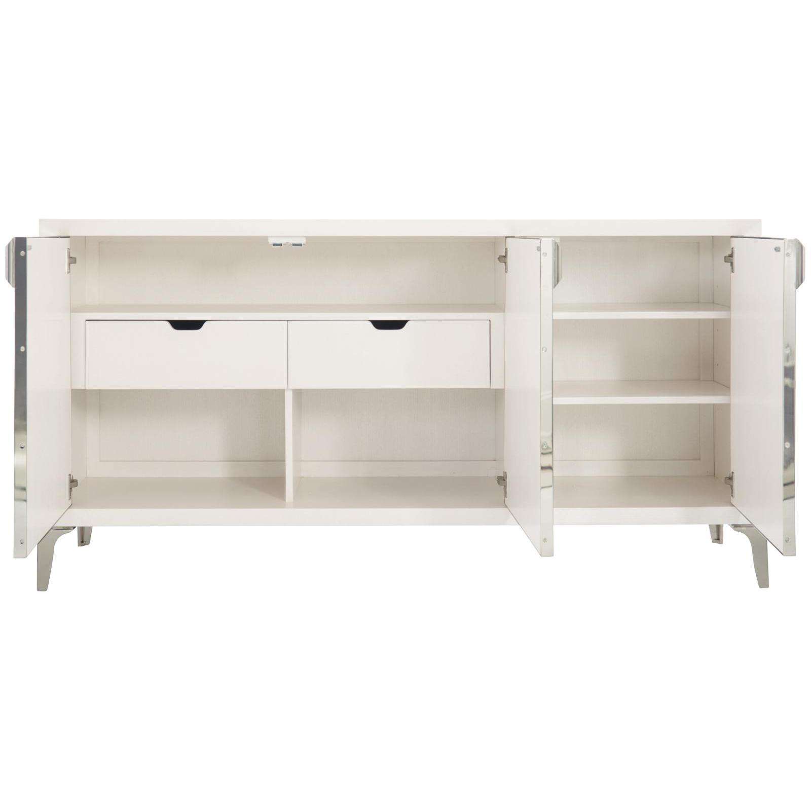 Three doors with recessed center polished stainless steel panel and rose design hardware Behind RSF door is one drawer with silverware insert and hand cut-out, two open compartments and a fixed bottom shelf surface Behind paired center and left doors is one adjustable/removable shelf and a fixed bottom shelf surface Polished stainless steel legs with open design Adjustable glides Anti-tip kit Specifications subject to change without notice. Due to differences in screen resolutions, the fabrics and finishes displayed may vary from the actual fabric and finish colors.