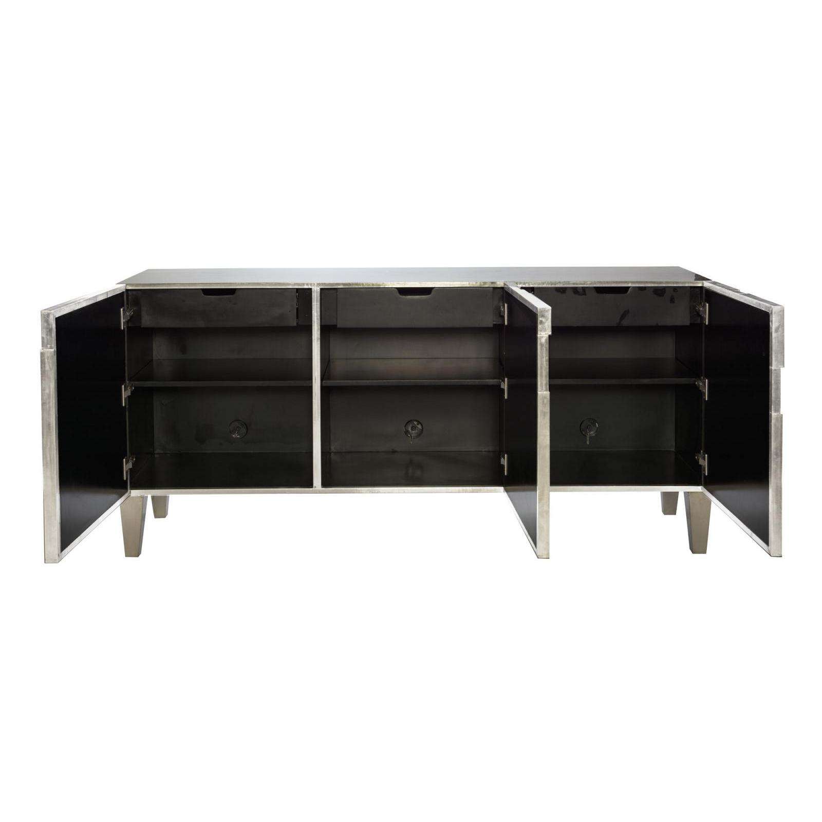 German Silver wrapped case Learn more about German Silver › Three doors Behind each door is one drawer with hand cut-out, one adjustable/removable shelf and one covered grommet hole in back panel for wire management Painted black interior and case back Adjustable glides Anti-tip kit Specifications subject to change without notice. Due to differences in screen resolutions, the fabrics and finishes displayed may vary from the actual fabric and finish colors.