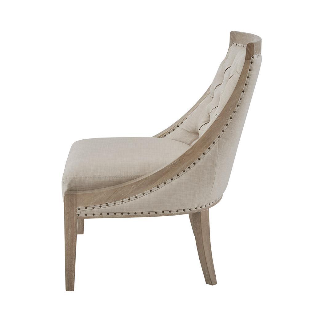 The Madison Park Christy Accent Chair beautifully blends elegance with a farmhouse flair to update your home. This accent chair features a button tufted back and a bronze nail head trim that adds a luxurious touch to the design. The natural hued upholstery is complemented by the solid wood frame and legs for a farmhouse style look. With its recessed arms creating a simple silhouette, this accent chair will easily complement your décor and comes fully assembled.