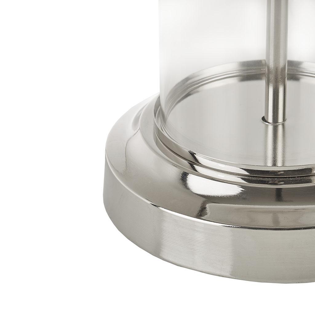 Update your living room or bedroom with the sleek style of the Clarity Table Lamp. The sbase is made from metal and glass with a silver nickel finish, for an elegant touch. A off white drum-shaped shade softly filters the light, while also beautifully complementing the striking look. Providing plenty of length a 72-inch clear cord and an on/off switch on the socket, this table lamp is easy to incorporate into your existing space and perfect for accenting any transitional home decor. One Type A light bulb is needed. Comes with a 2-year warranty.