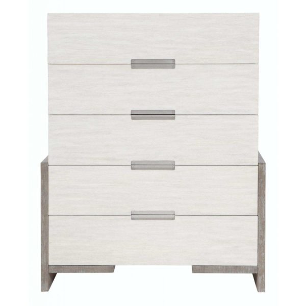 Two-tone finish – Case in Linen finish and outside of case in Light Shale finish Five soft-closing drawers with finger pull with inset brushed stainless steel plate Adjustable glides Anti-tip kit Note: Not designed to support TV &/or other media Specifications subject to change without notice. Due to differences in screen resolutions, the fabrics and finishes displayed may vary from the actual fabric and finish colors.