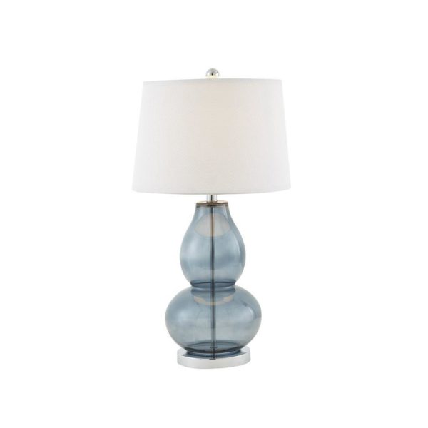 The Gannet Table Lamp brings a touch of elegance. This blue glass and metal table lamp features a stylized curved shaped base provides a beautiful sophisticated look. A white drum lamp shade is sure to create a perfectly balanced design. Set this elegant table lamp in your living room or home office to complete the look of your decor. The table lamp comes as a set of two. One Type A light bulb is needed. Comes with a 2-year warranty.