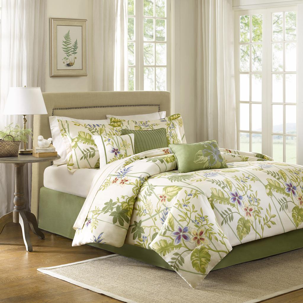 Create a resort feel in your own home with the Madison Park Kannapali Collection. This tropical floral design is printed on 200 thread count cotton twill adding dimension to your top of bed. A solid ivory reverse complements the top of the bed, while two matching shams complete the floral comforter set. Three fun decorative pillows use printing, pleating and embroidery techniques to pull this whole look together. Hypoallergenic polyester filling in the comforter and pillows provides exceptional comfort and warmth. Machine washable for easy care, this cotton comforter set brings a relaxing and charming touch to your bedroom.