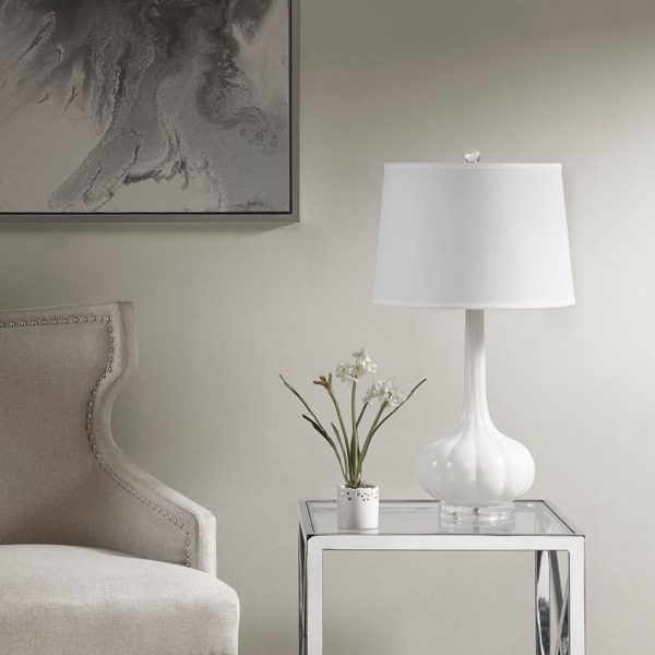 The Madison Park Leighton Table Lamp provides a stunning addition to your space. The white glass base is complimented by a nature fabric empire shape shade will create a soft glow to any room. Plug into a power source using the 72-inch clear cord and flip the light on with the on/off switch to brighten up your room. One 60-watt incandescent bulb or one spiral 13-watt CFL light bulb is needed (one bulb included). Comes with a 2-year warranty.