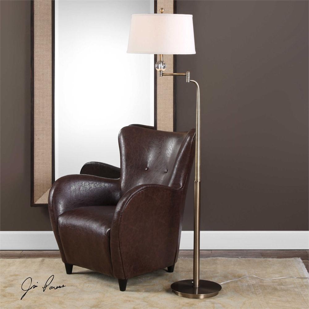 Tapered steel base featuring a gracefully curved top and rotating shade arm, with a crystal ball accent. The tapered round hardback shade is a beige linen fabric with natural slubbing.