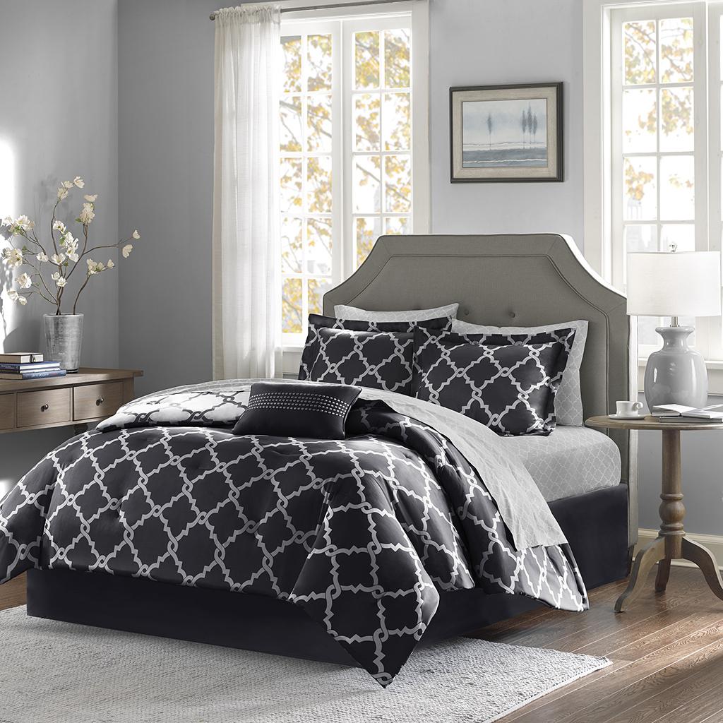 The Madison Park Essentials Merritt Complete Bed and Sheet Set creates a simple yet chic look in your space. The fretwork design creates a modern look with its white design on a soft grey base. This set is completely reversible to a white base with grey design allowing you to change the feel of your room instantly. A 100% cotton printed sheet set also features a smaller scale fretwork pattern for a finished look.