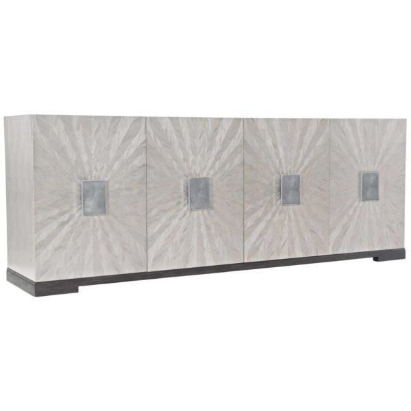 Prima Vera veneers in Light Gray finish Four fancy face doors Behind end doors is one adjustable/removable shelf, ventilation holes and one grommet hole with cover and bottom shelf surface Behind paired center doors is one fixed shelf, one drawer with finger pull, bottom shelf surface, ventilation holes and two grommet holes with cover in back panel Base in Matte Black finish Adjustable glides Anti-tip kit Specifications subject to change without notice. Due to differences in screen resolutions, the fabrics and finishes displayed may vary from the actual fabric and finish colors.