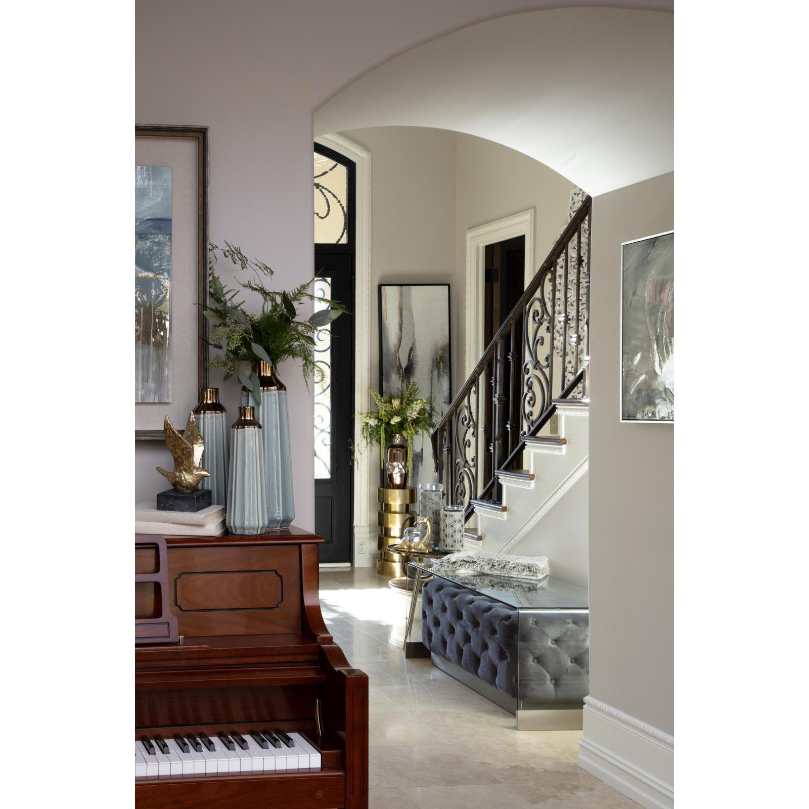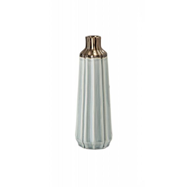 The set of three gold and teal Nakasa Nadia ceramic vases add a touch of class and elegance wherever they reside. They can be arranged in a grouping with identical or complementary dry floral arrangements, or displayed around the room to create eye movement. In addition, they can be set in a row on a table to create a centerpiece.