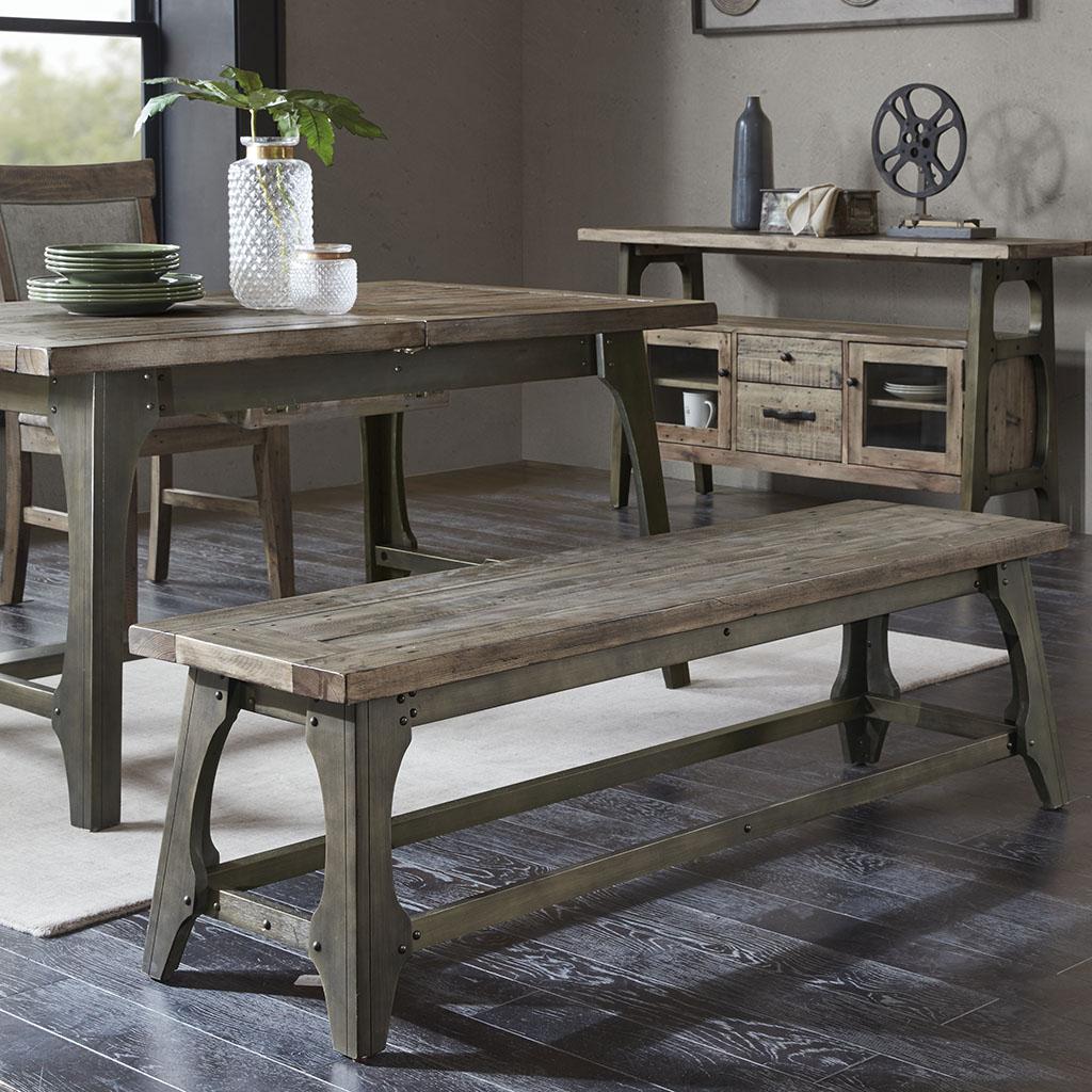 Complete your dining space with the rustic style of INK+IVY’s Oliver Dining Bench. This dining bench features hand-distressed detailing and a weathered grey wood finish on the seat, for a natural appeal. An antique bronze hue on the wooden legs complements the design, creating a striking look. Beautifully crafted, this dining bench adds a simple industrial update to your dining room or kitchen. Leg assembly is required.