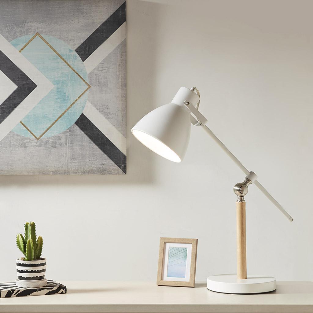 The Urban Habitat Owen Table Lamp brings a clean and simple touch to any room in your home. This table lamp features a white cylinder shade with white metal base and wooden stand to create a refreshing casual design. A 72-inch brown cord with an on/off switch provides plenty of length to place this task lamp anywhere in your home. Great for your home office, this table lamp adds a unique style and functionality to your décor. Comes with a 2 year limited warranty. 1 Type-A light bulb is needed and NOT included. Spot clean only.