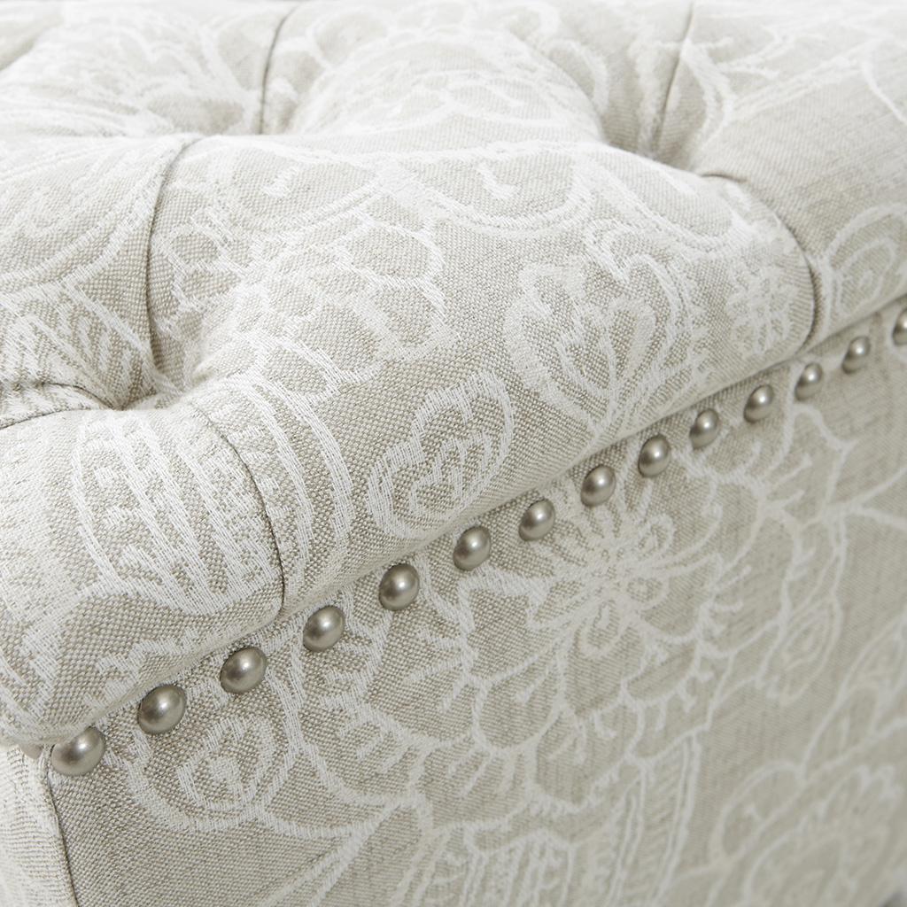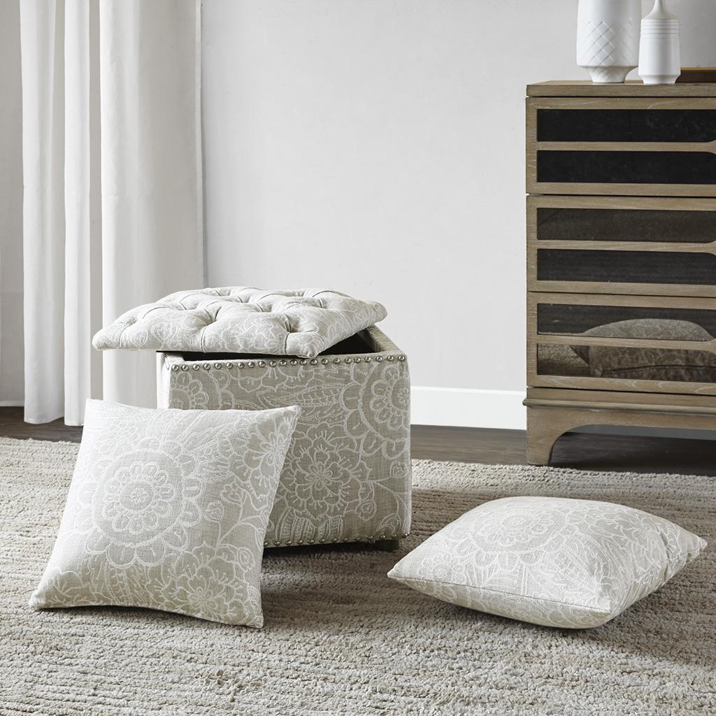 Complete your living room decor with the Madison Park Palisade Storage Ottoman. This square ottoman is upholstered in a natural-hued fabric and features a button-tufted top for an elegant look. A pewter nail head trim adds a sophisticated touch to elevate the design. The top lifts open to an ample storage space that’s perfect for your blankets and other living room essentials. A dark coffee wood finish on the solid wood legs provides a sturdy base and complements the upholstery for a beautiful contrast. Leg assembly is required and no tools are needed.