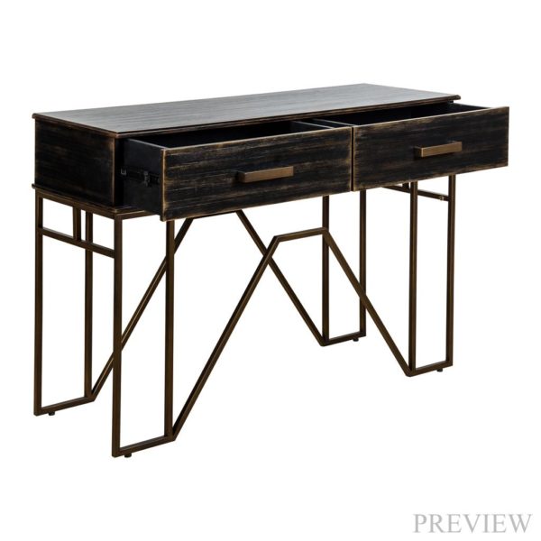 The Madison Park Signature Paragon Console Table introduces a sleek and simple elegance to your living space. This rectangular console table features a wood table top in a deep black finish that is complemented by the antique bronze finish on the metal base, for a stunning modern look. Two drawers open up to ample storage spaces to keep your essentials within easy reach. Place this console table in your living room to give your home a traditional update with a contemporary flair.