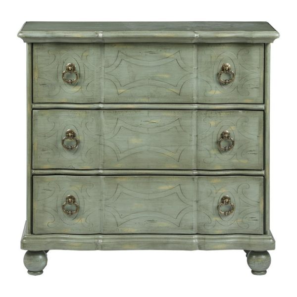 This hand painted accent chest with its blue-green antiqued finish and scrolling work detailing will add flair to any extra space.