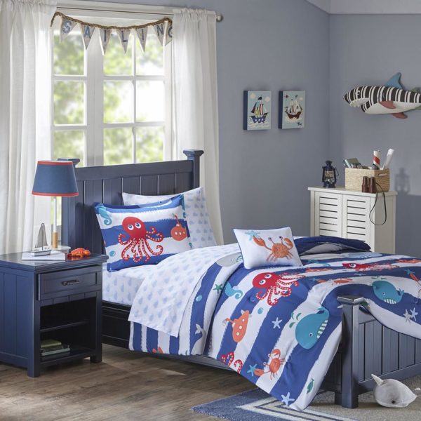 Dive to the depths of dreamland with the Mi Zone Kids Sealife Complete Bed and Sheet Set. Featuring a nautical color palette of blue and white, the comforter showcases a variety of adorable sea creatures like turtles, octopi, and sea horses. Individual hand cut shams borrow the designs seen on the top of bed to give you a matching sham(s). Pillowcase(s), a fitted sheet, and a flat sheet printed with delightful whales are included, allowing you to fully immerse yourself in the sea life. A decorative pillow embroidered with a smiling crab adds the finishing touches to this marine bed and sheet set.