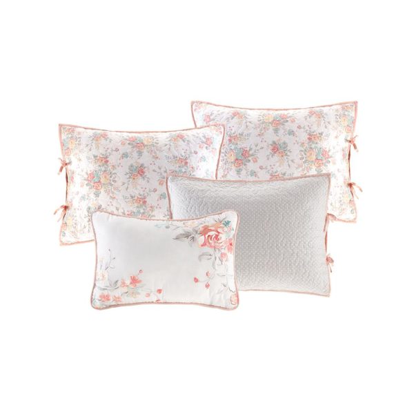 Provide your guests with a cottage look with the Serendipity 6 Piece Reversible Daybed Cover Set. The quilted cover features a cottage inspired floral print in pink, coral, aqua and grey with three reversible shams for you to decorate the top of bed however you like. One decorative pillow and a bedskirt use coordinating fabrics to complete this look.