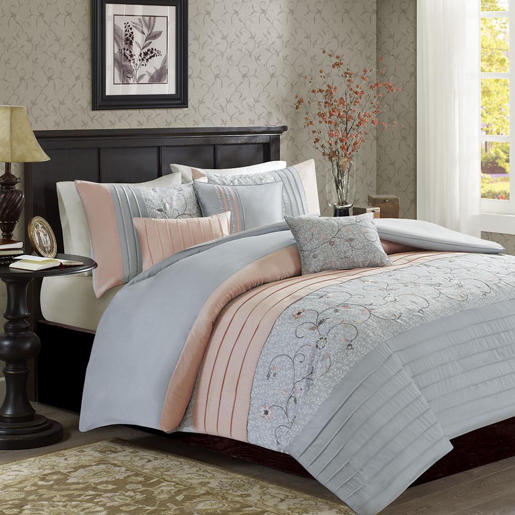 Elegantly update your bedroom with the Madison Park Serene 6 Piece Duvet Cover Set. A beautifully embroidered floral pattern is showcased on the faux silk duvet cover. The pieced design, in yellow and grey hues, adds a lovely contrast and texture to the ensemble. A solid dark grey reverse complements the enticing design seen on the top of the duvet cover. Matching shams bring the unique style of the duvet cover to the head of the bed, giving it a truly luxurious look. Three decorative pillows with intricate embroidery, pleating, and piecing, complete this exquisite duvet cover set.