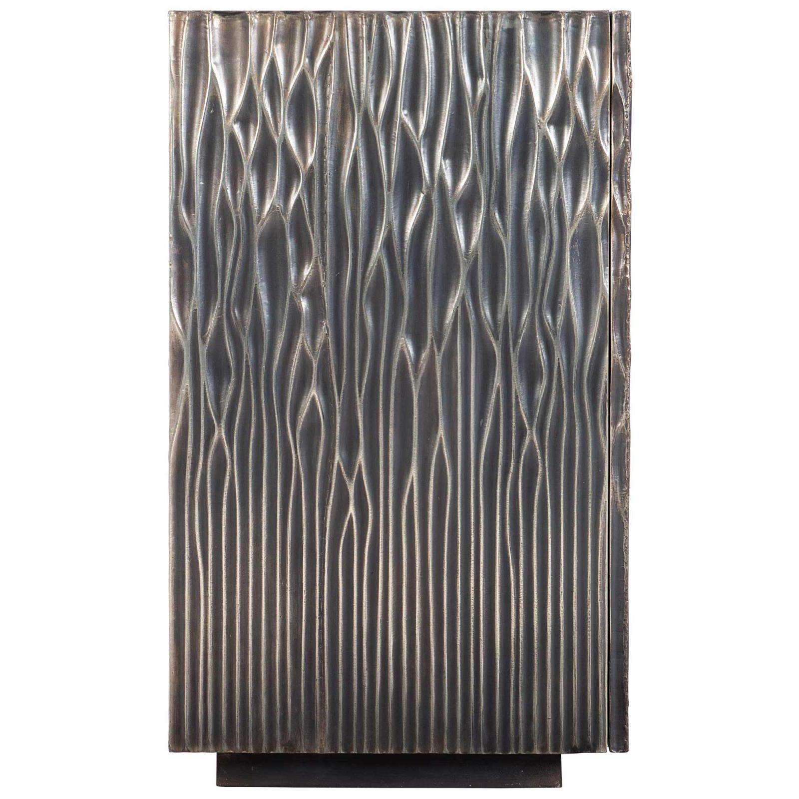 German silver wrapped case with textured/patterned doors and ends in Antique Silver finish Learn more about German Silver › Two soft-closing doors Behind each door is one drawer and one adjustable/removable shelf and one grommet hole with cover in back panel White painted interior Unfinished white back panel Adjustable glides Anti-tip kit Specifications subject to change without notice. Due to differences in screen resolutions, the fabrics and finishes displayed may vary from the actual fabric and finish colors.