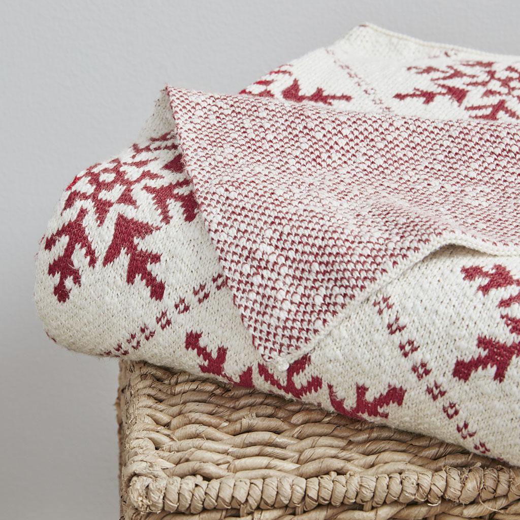 Wrap yourself in the rich comfort of the Madison Park Snowflake Cotton Knit Throw. This cotton jacquard blanket features a red snowflake pattern on a white ground, for a charming cottage look. With a heavier weight than other knitted blankets, this knit throw is great for bundling up with on the couch or using as extra layer of warmth on your bed. Machine washable for easy care, this jacquard knitted throw measures 50”x60” and adds a festive touch to any decor.
