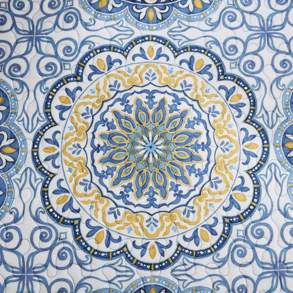 Provide your guests with a cozy new look with the Tangiers 6 Piece Reversible Daybed Cover Set. The printed, quilted cover features a french country medallion motif in blue and yellow with three reversible shams for you to decorate the top of bed however you like. One decorative pillow and a bedskirt use coordinating fabrics to complete this look.