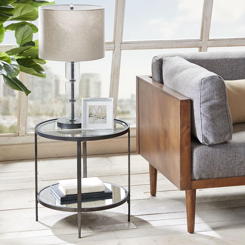 The INK+IVY Tatum End Table introduces a sleek and elegant mid-century appeal to your home. This round end table features a tempered glass table top and a solid metal frame in a gunmetal finish, for a strikingly bold look. A mirrored lower shelf provides plenty of space to place your essential items, keeping them within easy reach. With its modern flair, this mid-century inspired end table brings new life to your living room decor. Leg assembly required.