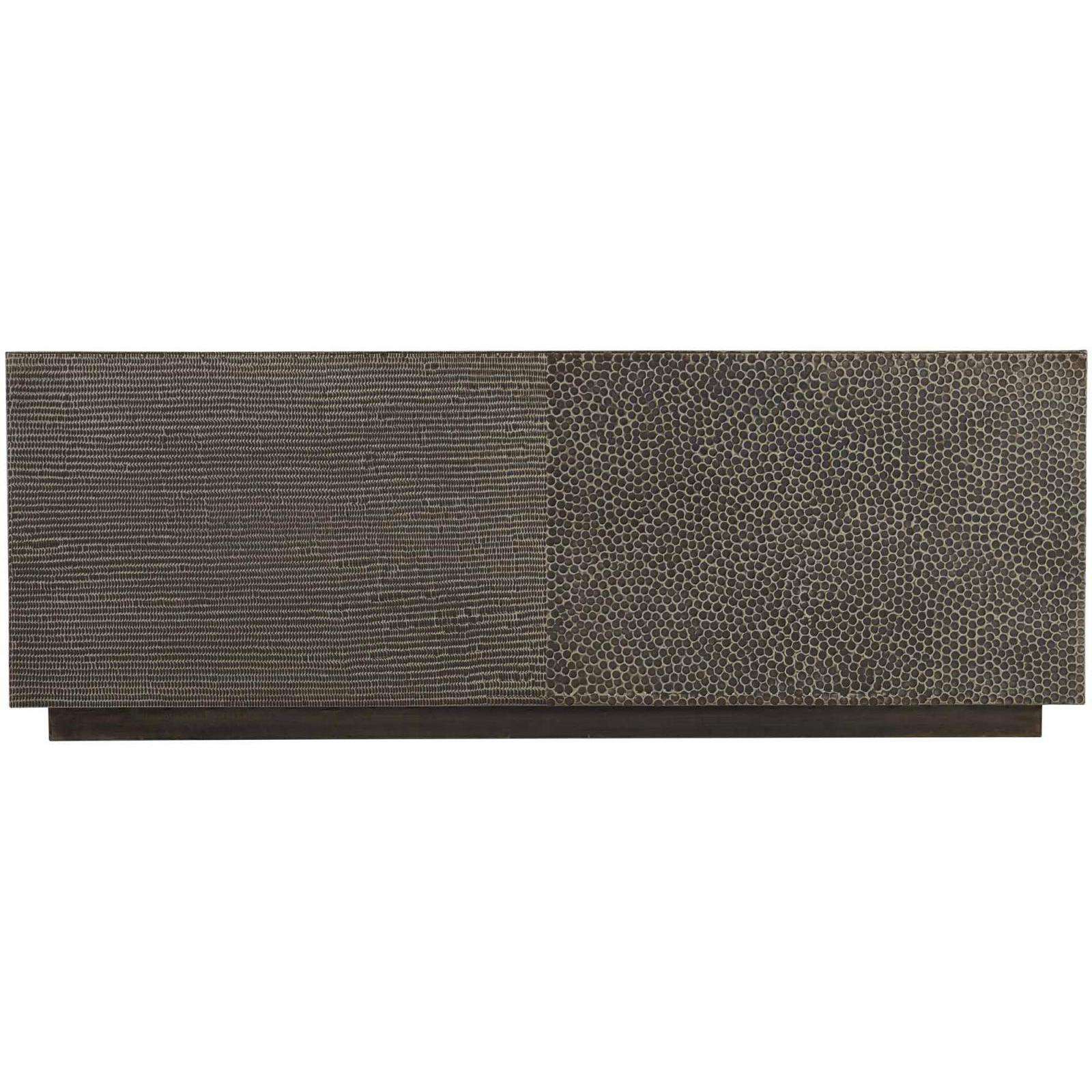 Antiqued finish Inset textured pattern metal top Case wrapped in textured metal panels Plinth base Casters Specifications subject to change without notice. Due to differences in screen resolutions, the fabrics and finishes displayed may vary from the actual fabric and finish colors.