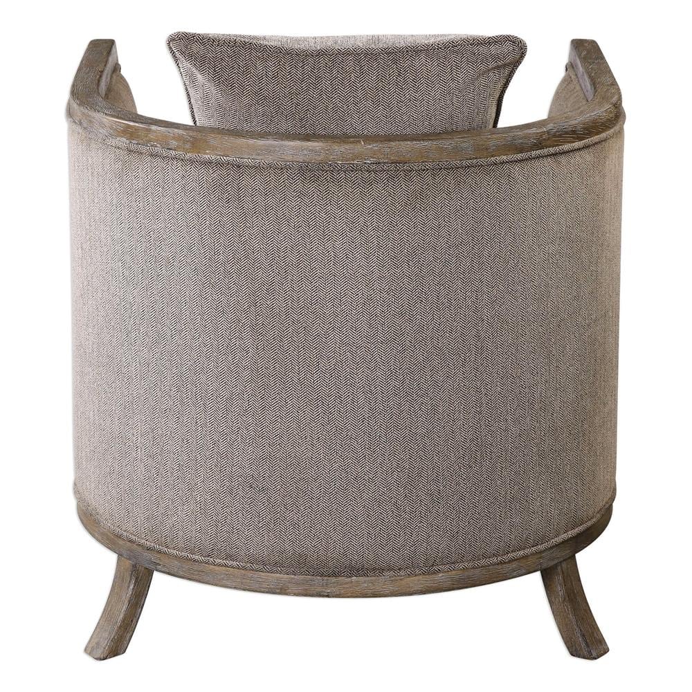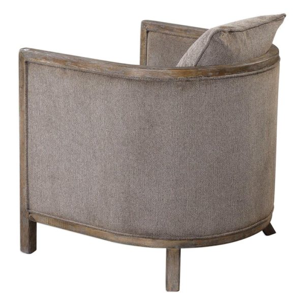 Versatile tub chair with a wonderful 360 degree view. The softly weathered exposed hardwood frame is lightly washed in gray to blend with the shimmering gray chenille neutral flaxen fabric. Great to float in any space. Seat height is 18â?.