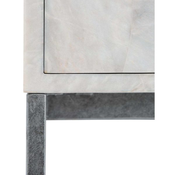 Drawer box with two drawers with White Marble in crazy cut pattern Tubular steel base in Antique Pewter finish Adjustable glides Anti-tip kit Specifications subject to change without notice. Due to differences in screen resolutions, the fabrics and finishes displayed may vary from the actual fabric and finish colors.